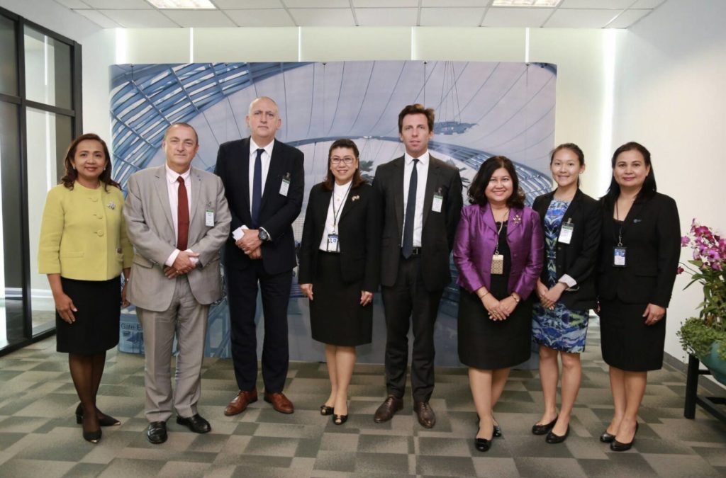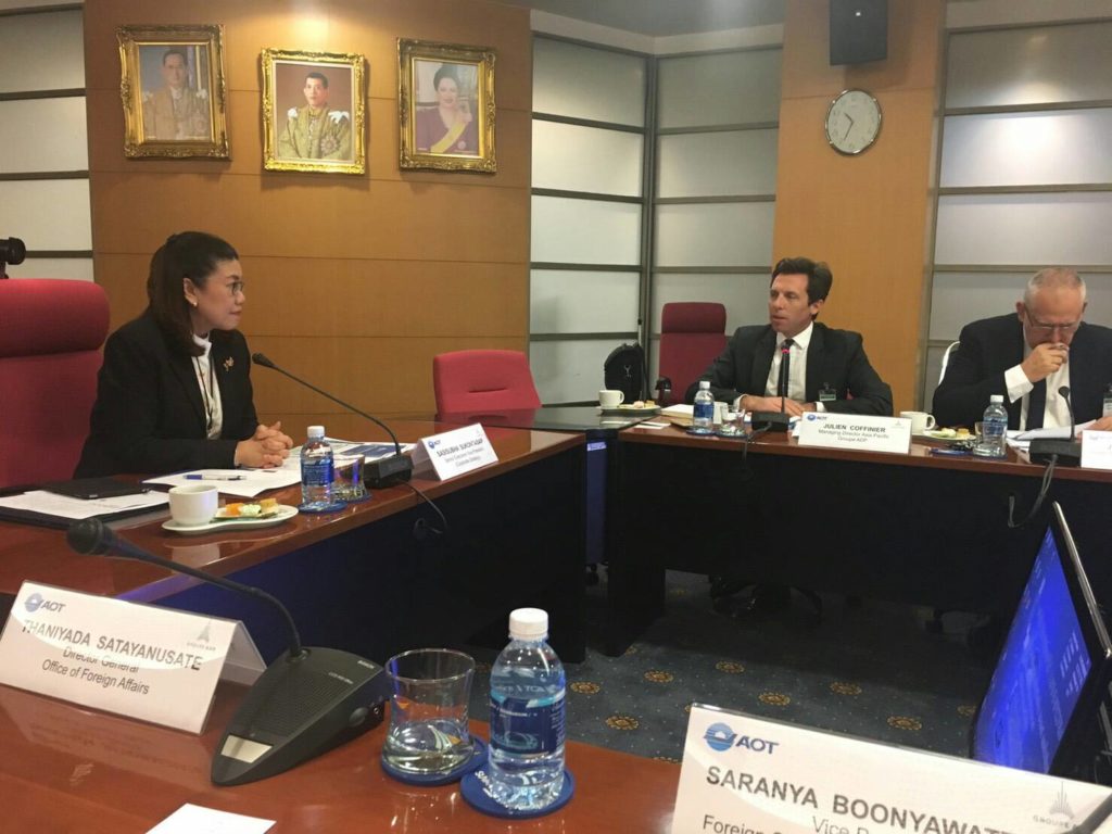 Groupe Aéroport de Paris delegates visited Suvarnabhumi Airport to attend a meeting with AOT representatives on 23 January 2018 where Ms. Sasisubha Sukontasap, Senior Executive Vice President (Corporate Strategy) presided over the meeting.  AOT representatives welcomed Mr.Julien Coffinier, Managing Director Asia Pacific, Mr.Jean-Yves Coulot, Head of Engineering & Design Practice in Asia, Mr. Patrice Bastid, Senior Vice President, ADP International in charge of operations and Ms. Sandra Long, Business Development Analyst for the APAC region at the meeting on the 5th floor of AOB building Suvarnabhumi Airport.