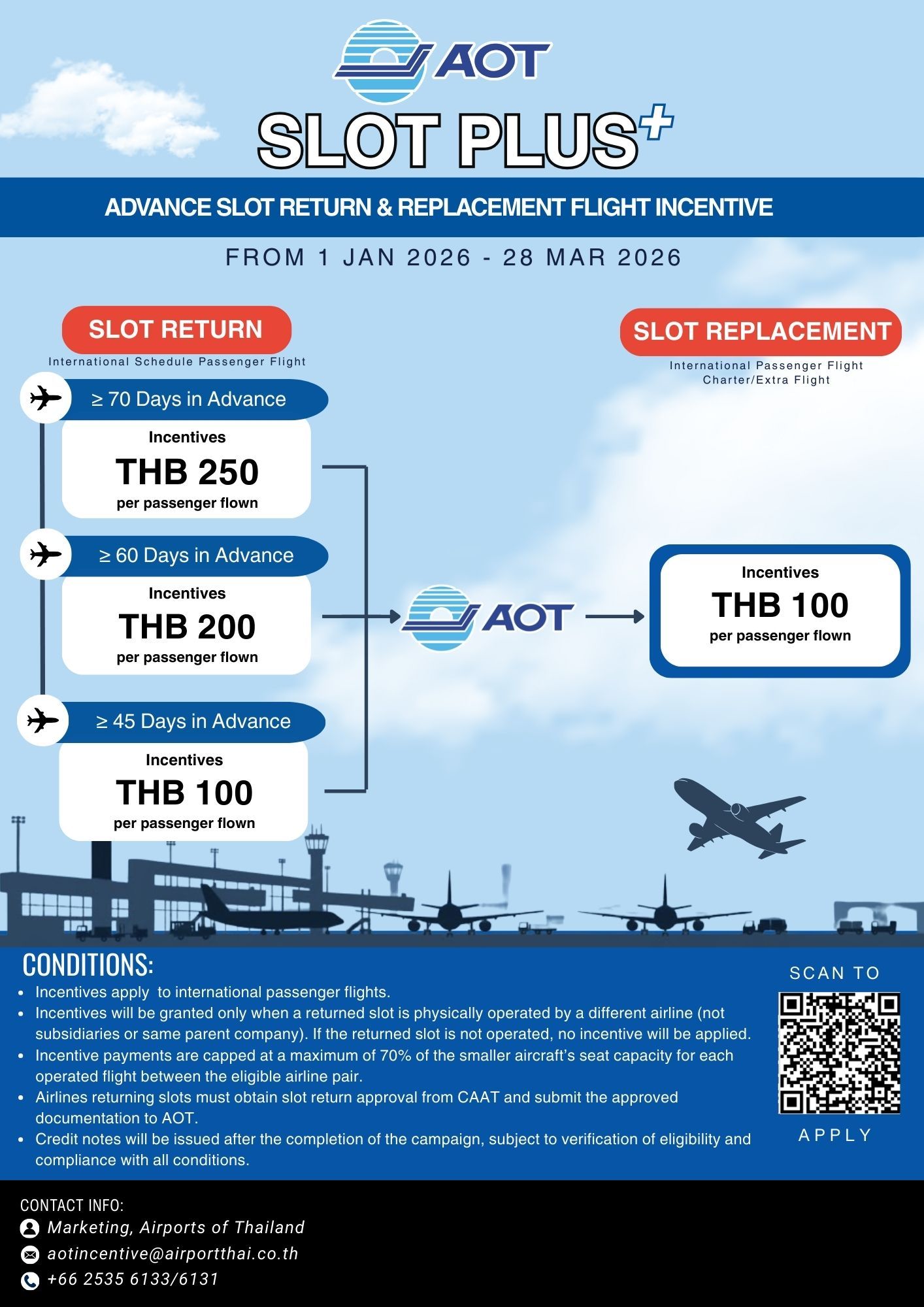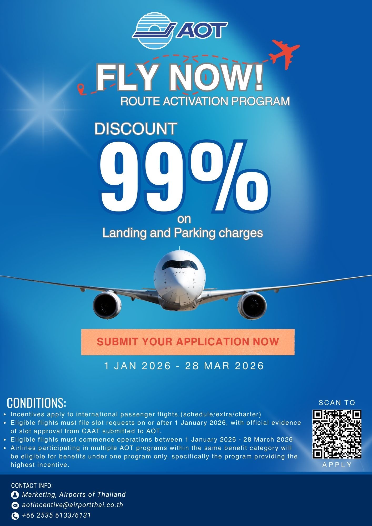 โครงการส่งเสริมการตลาดด้านการบิน โครงการกระตุ้นเส้นทางการบินใหม่ 2566-2568 ของสายการบิน ณ ท่าอากาศยานของ ทอท. Click to apply > Airports of Thailand Incentive Application 2026 Click to apply > Airports of Thailand Incentive Application 2026